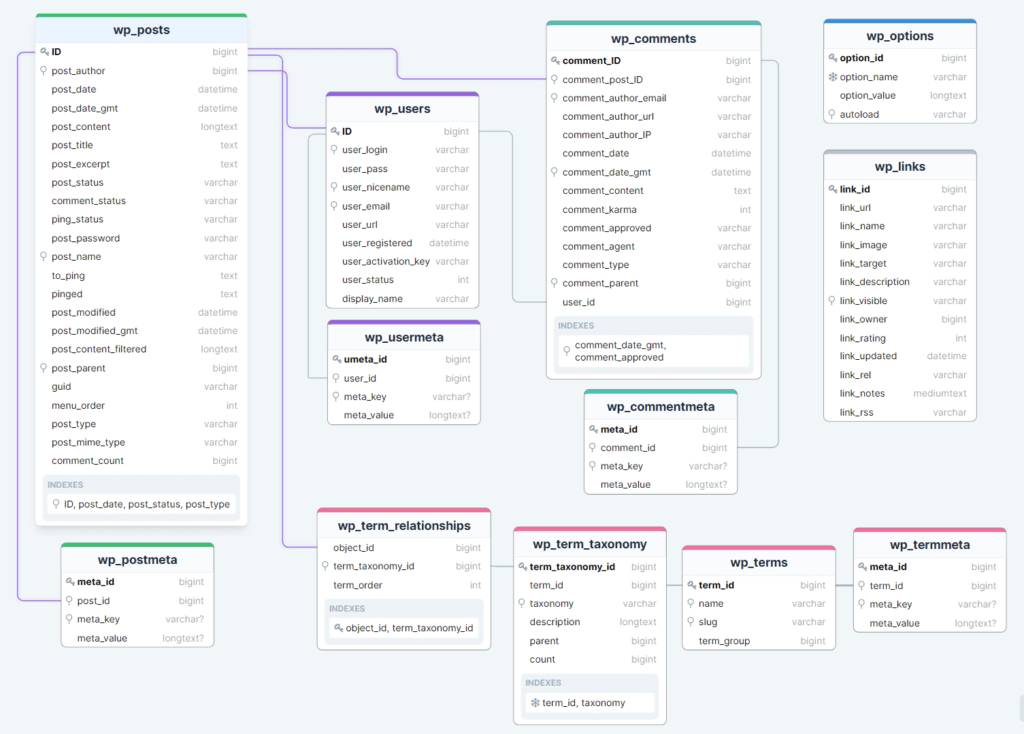 The diagram below provides a visual overview of the WordPress database and the relations between the tables created during the WordPress standard installation. The Table Overview below includes additional details on the tables and columns.